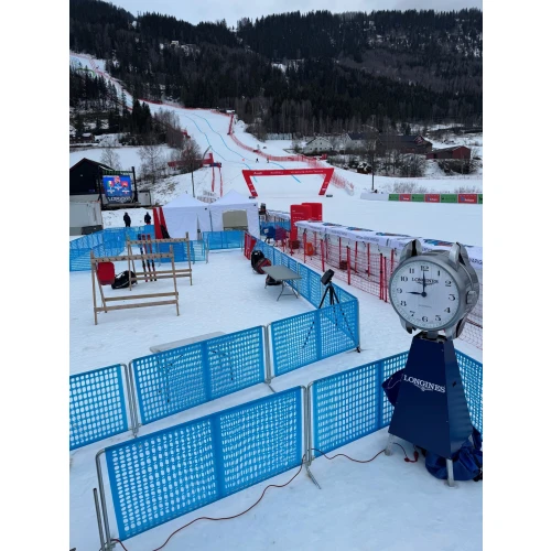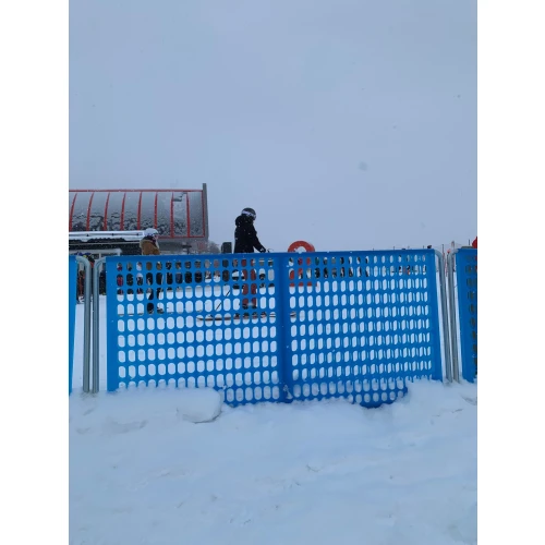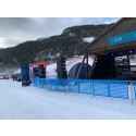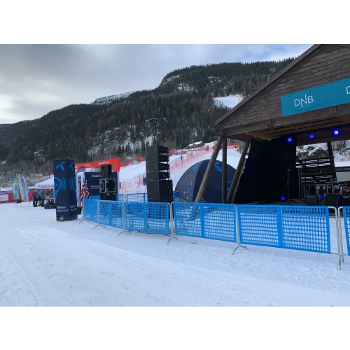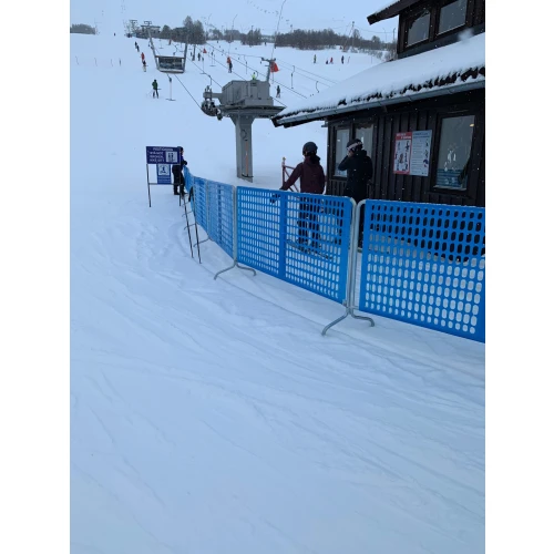 Fransk gjerde, avsperringsgjerde, publikumsgjerde med HPDE. Dette er selve gjerdet, føtter kjøpes løst. Enkelt å sette opp. Kan settes opp i alle vinkler, føttene vris enkelt. Solid. Mulighet for overtrekk med reklametrykk.